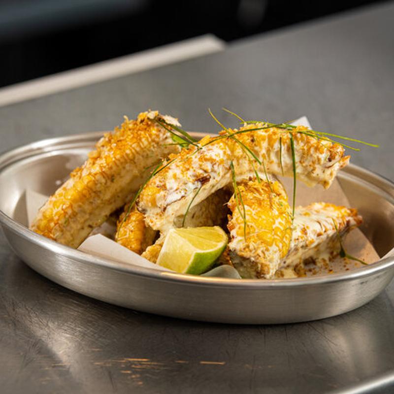 Charred corn “rib” sections smothered in elote mayo, cotija, chili lime seasoning, and cilantro. Messy in the best way.