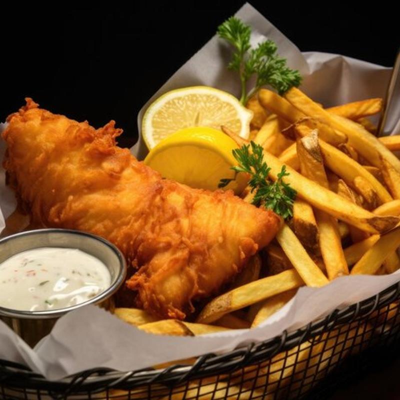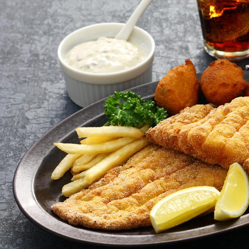 Crispy-seasoned whitefish fillets served with fries, tartar sauce, and lemon.