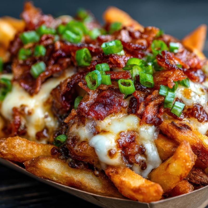 A mountain of fries stacked with melted cheese, bacon, scallions, and drizzle-worthy ranch. Load up the vibe.