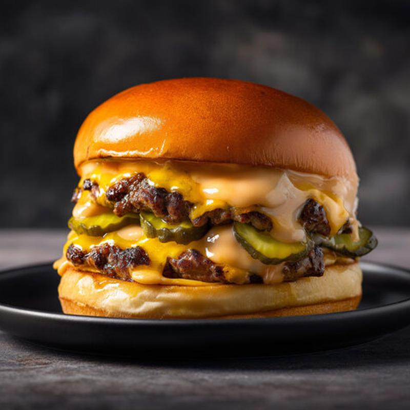 Two crispy-edged smash patties, American cheese, City Sauce, pickles, and onions on a toasted brioche bun.