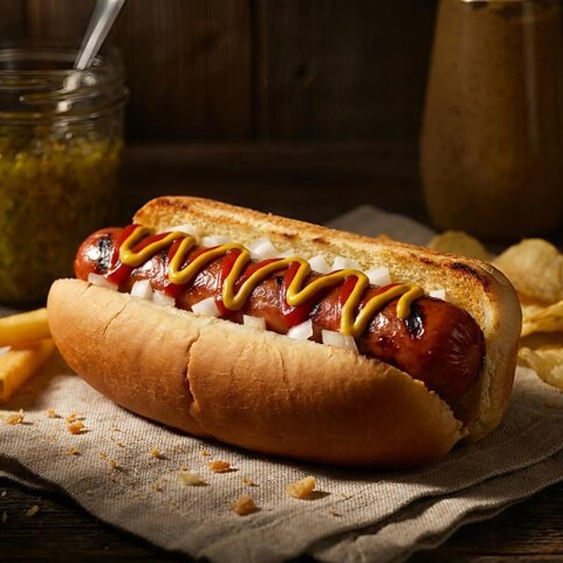 All-beef Angus dog topped with cheese, onion, and mustard.