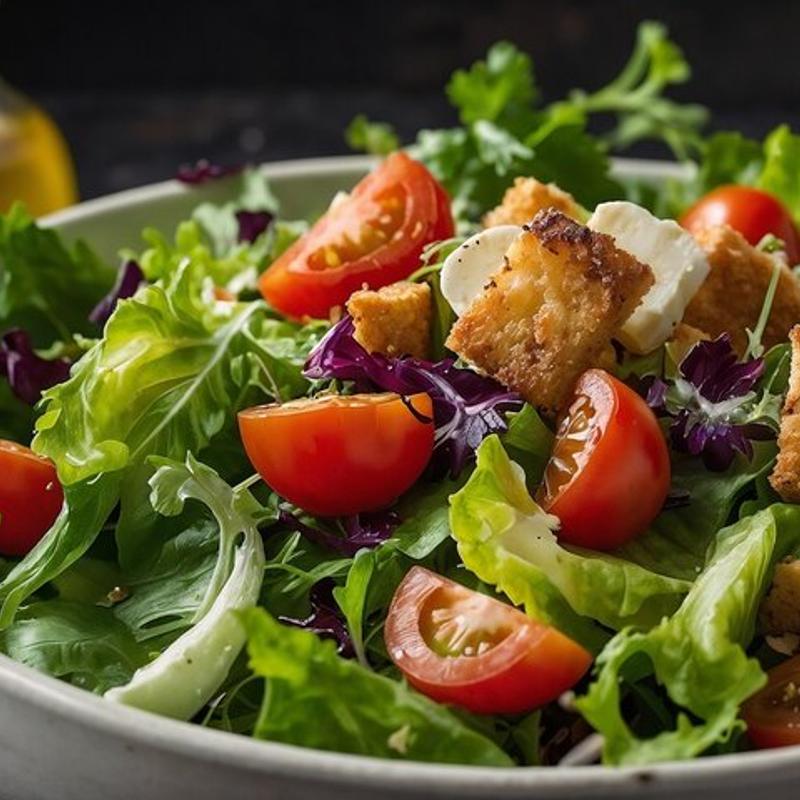 A hearty salad with mixed greens, cucumbers, tomatoes, red onion, shredded cheese, and crunchy croutons. Add chicken to level up.