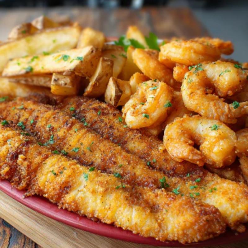 A combo of crispy whitefish and fried shrimp served with fries — the best of both vibes.