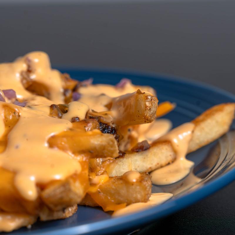 Our Vibe Fries smothered in melted cheese, green onion, and bacon.
