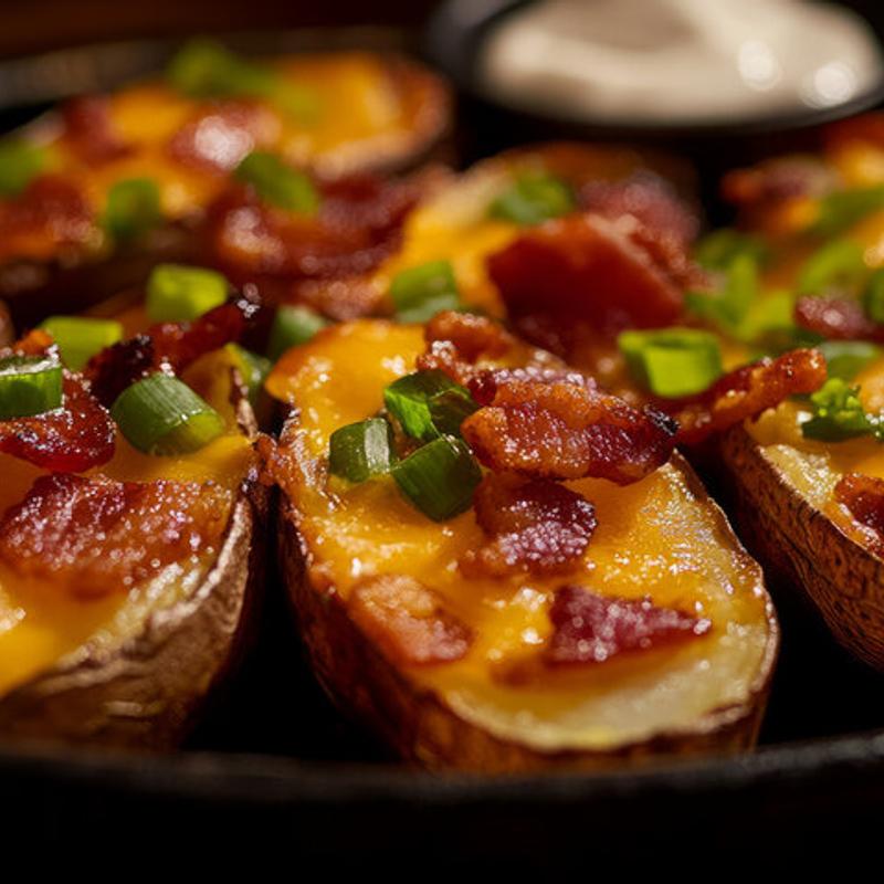 Crispy baked skins stuffed with cheese, bacon, and green onions. Finished with a dollop of sour cream.